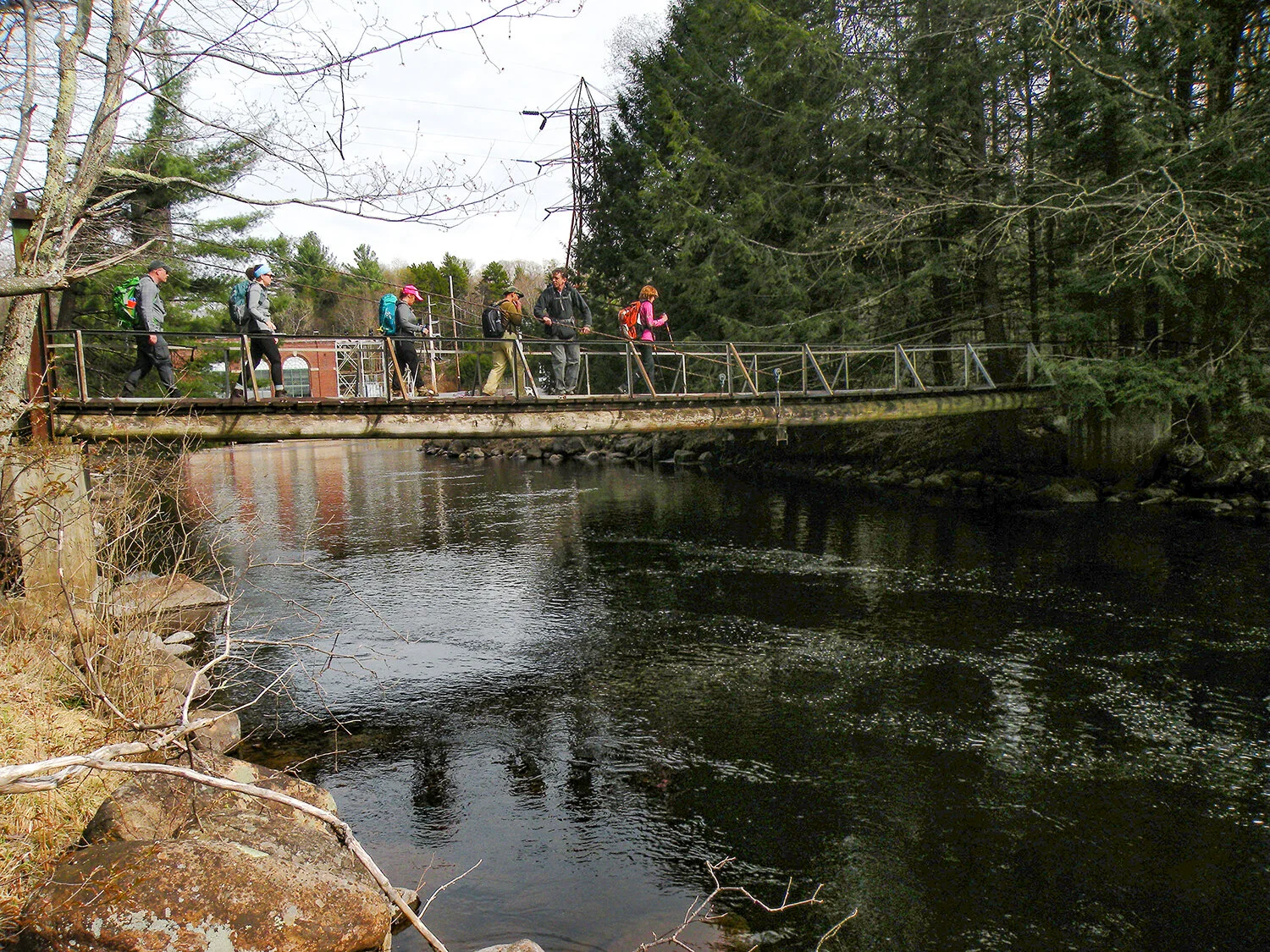 You cross the Beaver River on a suspension bridge, and after cutting through the woods you come out on a power line right-of-way. The trail crosses the clearing, but there are no further markers. State land begins on the far side, and once there you can hear the river through the trees. Several herd paths lead to the rocky bank, where the river roars through Moshier Falls.