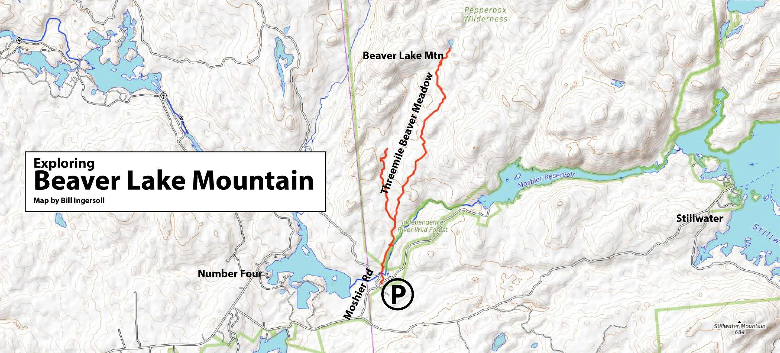 The trailhead for this hike is located on Moshier Road, near the Beaver River. To find Moshier Road, turn east off NY Route 12 onto River Street in the village of Lowville. River Street becomes Number Four Road outside the village limits and reaches the settlement of Bushes Landing in 4.4 miles, where it forks left. In 13.6 more miles, at the settlement of Number Four, the road turns right, becoming Stillwater Road. Pavement ends shortly.
