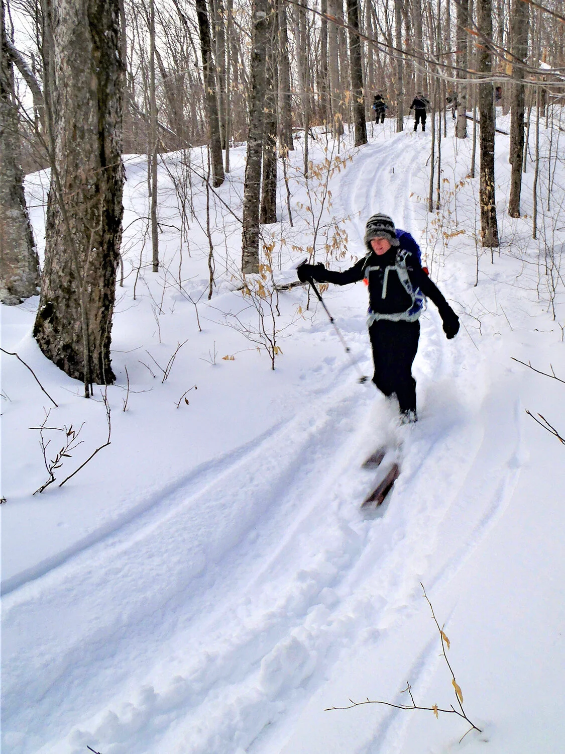 The Raymond Brook Ski Trail is found directly across the road. Initially, the trail climbs about 300 feet to an elevation of about 2,350 feet, before plummeting down, steeply at first, then moderating for a couple of miles. The trail is wide and can accommodate minor errors in technique. Raymond Brook may be seen down a ravine to your left. There is some uphill before reaching a four-way junction. The Raymond Brook Trail turns left and drops very steeply to an unplowed parking area next to Route 28. A right turn leads up to Rabbit Pond. Our thru-ski goes straight ahead on the Ski Bowl Connector Trail, and features a sweet 1.5-mile cruise with a loss of 500 feet in elevation, down to the finish (elevation 1,050 feet).