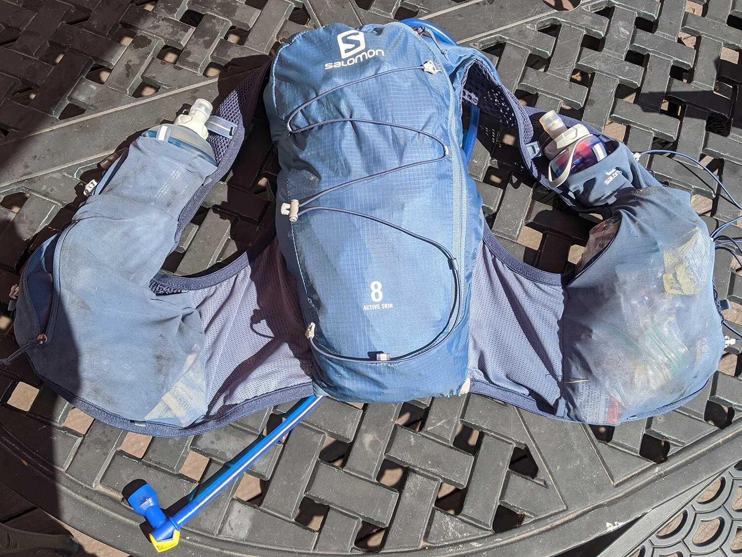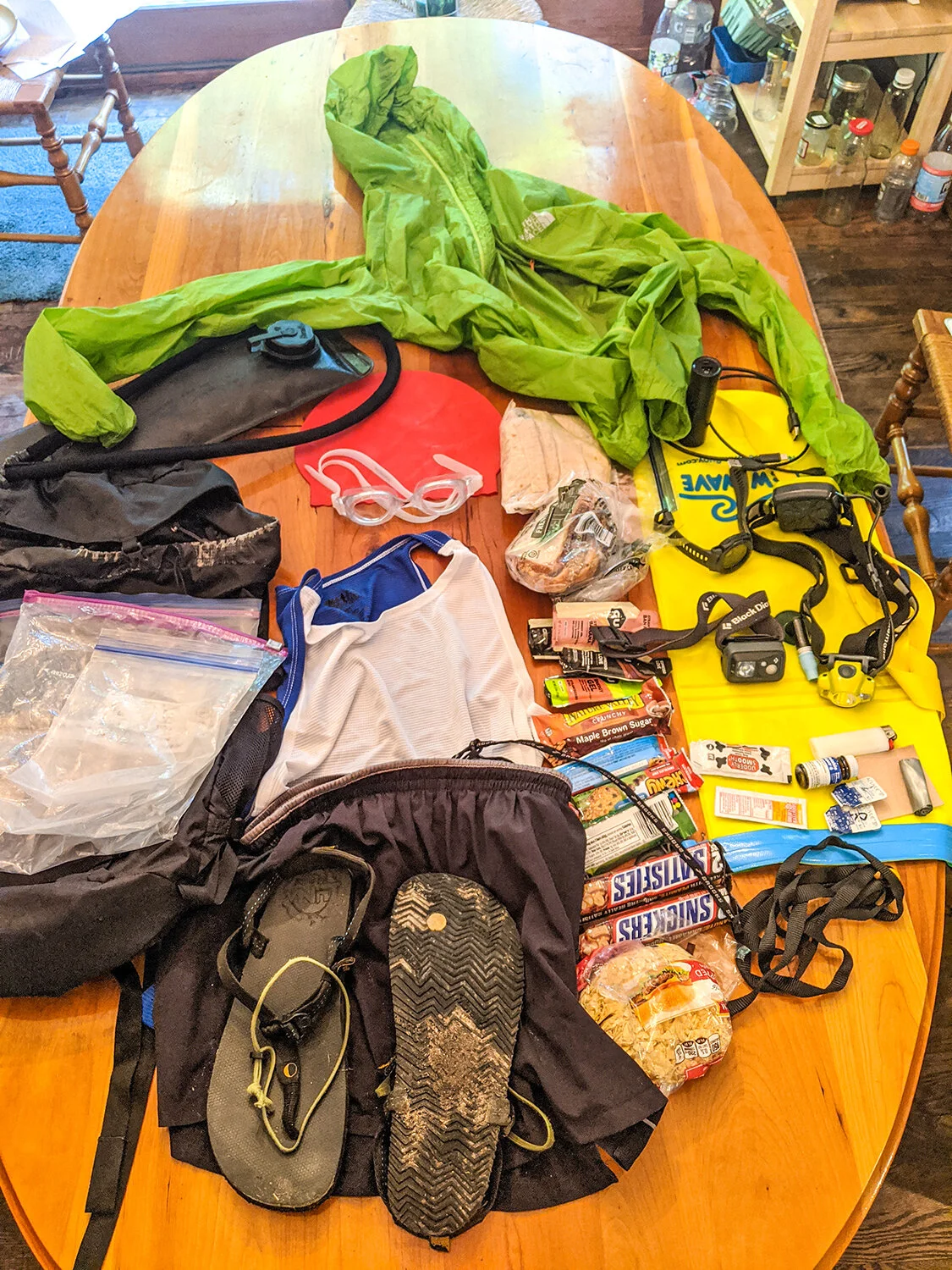 The trail to the lakeshore from Black is a steep and fun running trail. However, general confusion from a lack of sleep started to show up when Bill passed Tim without noticing. When Jake slowed down and said he was waiting for Tim, Bill was pretty sure Tim was way ahead - until Tim showed up from behind. Once we reached the waterline, only about 5K remained before the swim. After six hours of running over four mountains, this flat and easy 5K was harder than we anticipated. Along the way we encountered an unexpected gate with a “No Trespassing” sign, forcing us to get in the lake a little bit earlier than planned. We took a moment on shore to put the entire contents of our backpacks, including the backpack itself, into our packable floating swim buoys. We were all running in Luna sandals so there was no need to pack our shoes. In fact, they stayed on the whole day.
