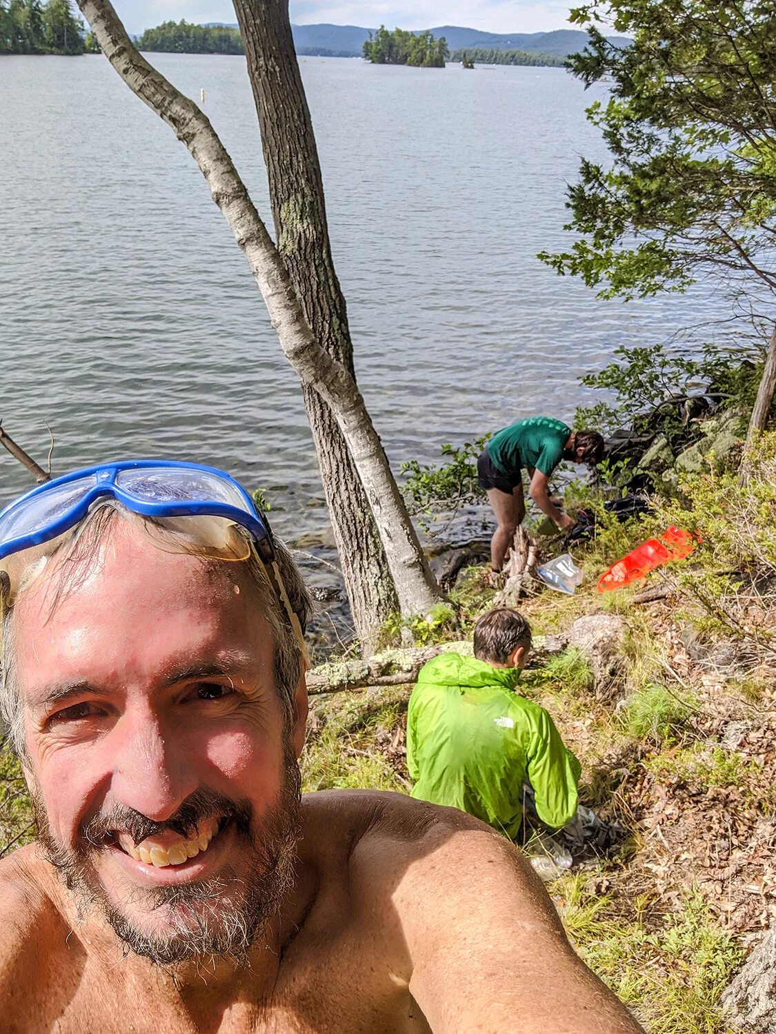 We skirted the shoreline to the closest point from the shore to Ranger Island. This is the longest segment of our swim and crosses an active boat lane. About halfway across, a DEC boat pulled up and said it was a good time for our swim since it was overcast and the boat traffic was low. Then he stumped us by asking, “Where are you at?” As in, “Where is your base camp?” We gave him blank stares, not knowing what to say as we mentally retrace our steps back to our nearest connection to anything, which would be our homes back in Clifton Park. Where are we at? We are here in the lake, three swimming hobos, our bindles floating behind us. After a few more questions and suggestions, he left us to finish our swim.