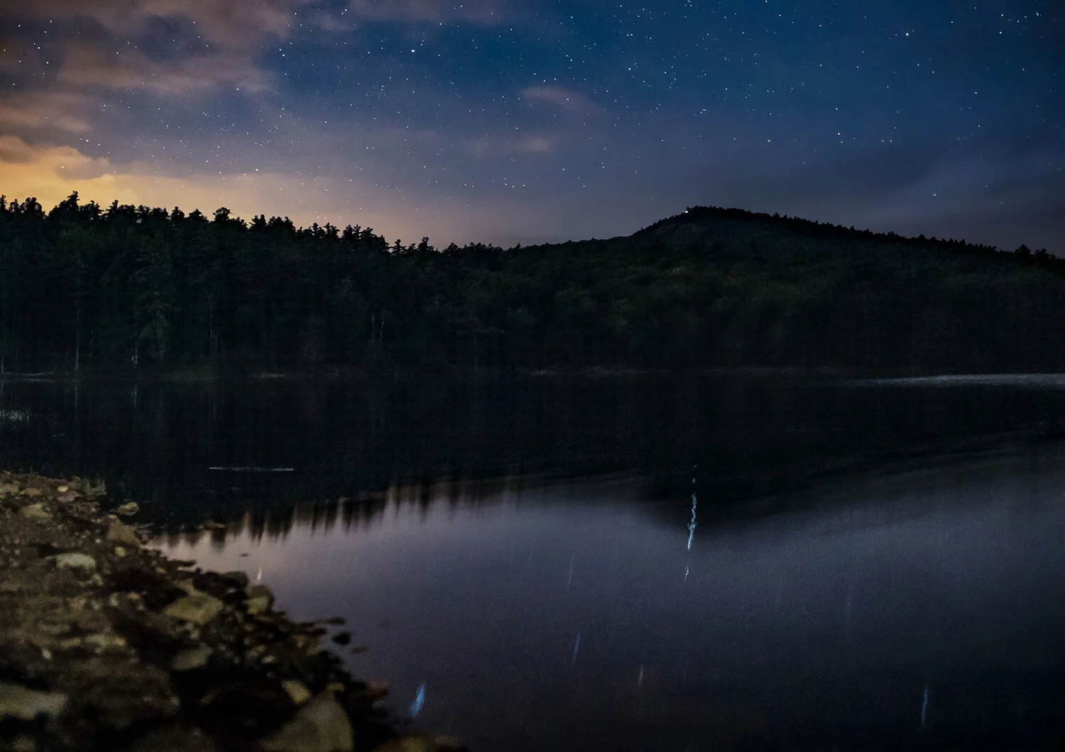 Headlamps on top of Cat Mountain with Edgecomb Pond in the foreground. While Bill’s wife, Naomi Hoffman, and fellow 12ster, Tim Ela, were waiting for Bill and Jake to finish Cat and Thomas mountains, they had no cell service so were not getting any updates. However, Naomi befriended a nighttime photographer, Will Adamczak of Milton, and he was able to see them by their headlamps moving around on the top of Cat.