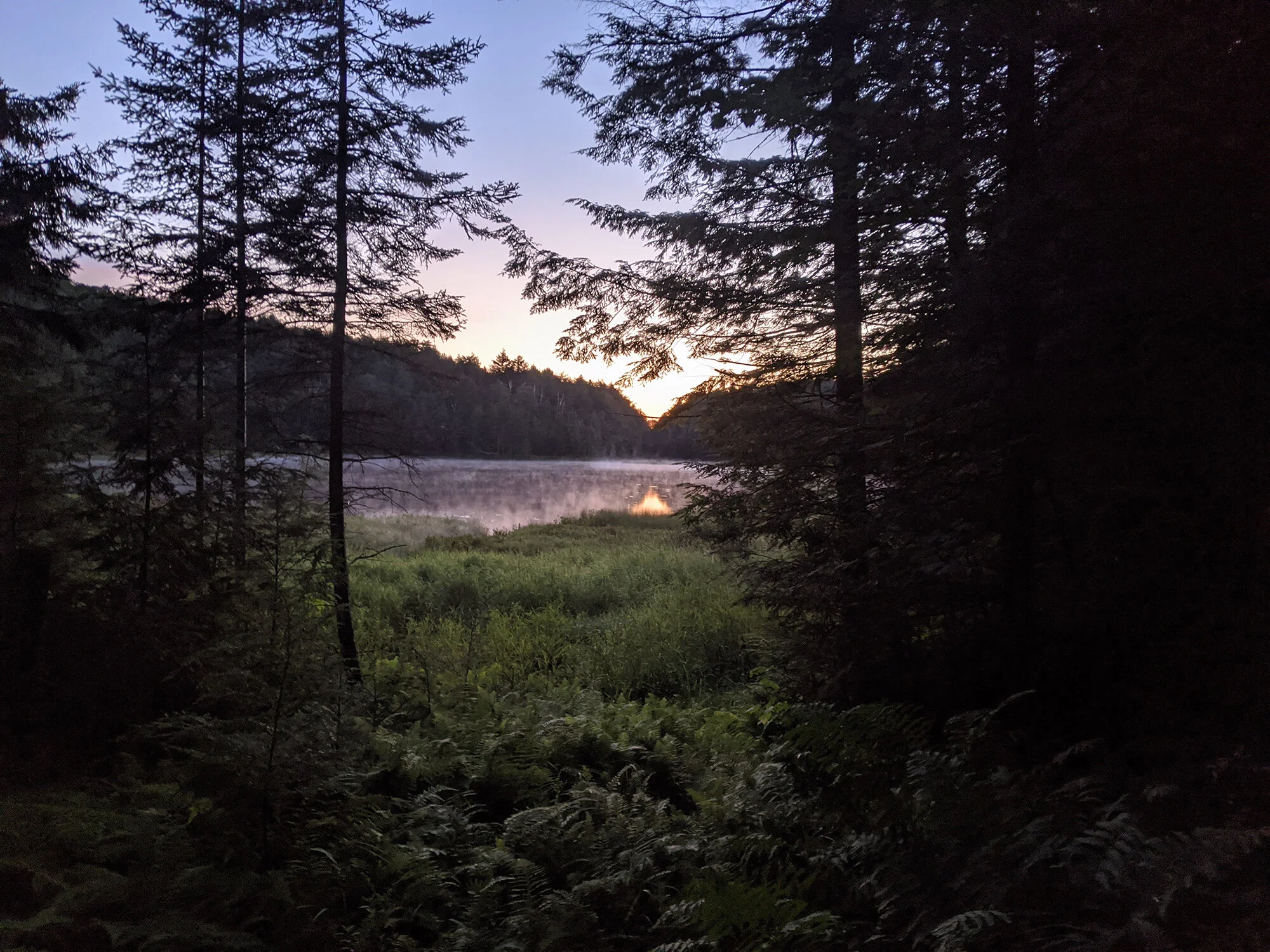 Shortly after Erebus, Bill’s headlamp started to fade due to a dying battery, and he remembered that he had charged a spare one that was still sitting safely by his bed at home. However, the sun started to rise and light soon filled the forest. We made the peak of Black Mountain at 6am. Low clouds carpeted the rolling mountains. We enjoyed one of the trip’s best views of the lake, and the nearby Tongue Mountain Range, while we refueled with a hearty breakfast.
