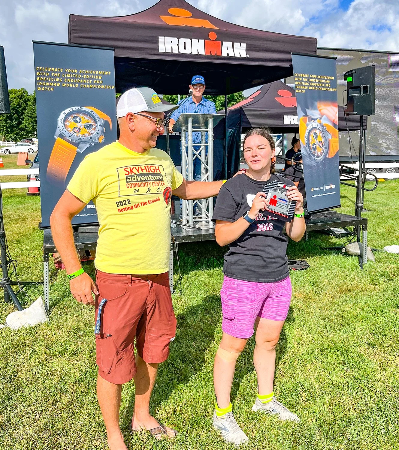 Receiving award from the voice of Ironman, Mike Reilly. Kristen Hislop