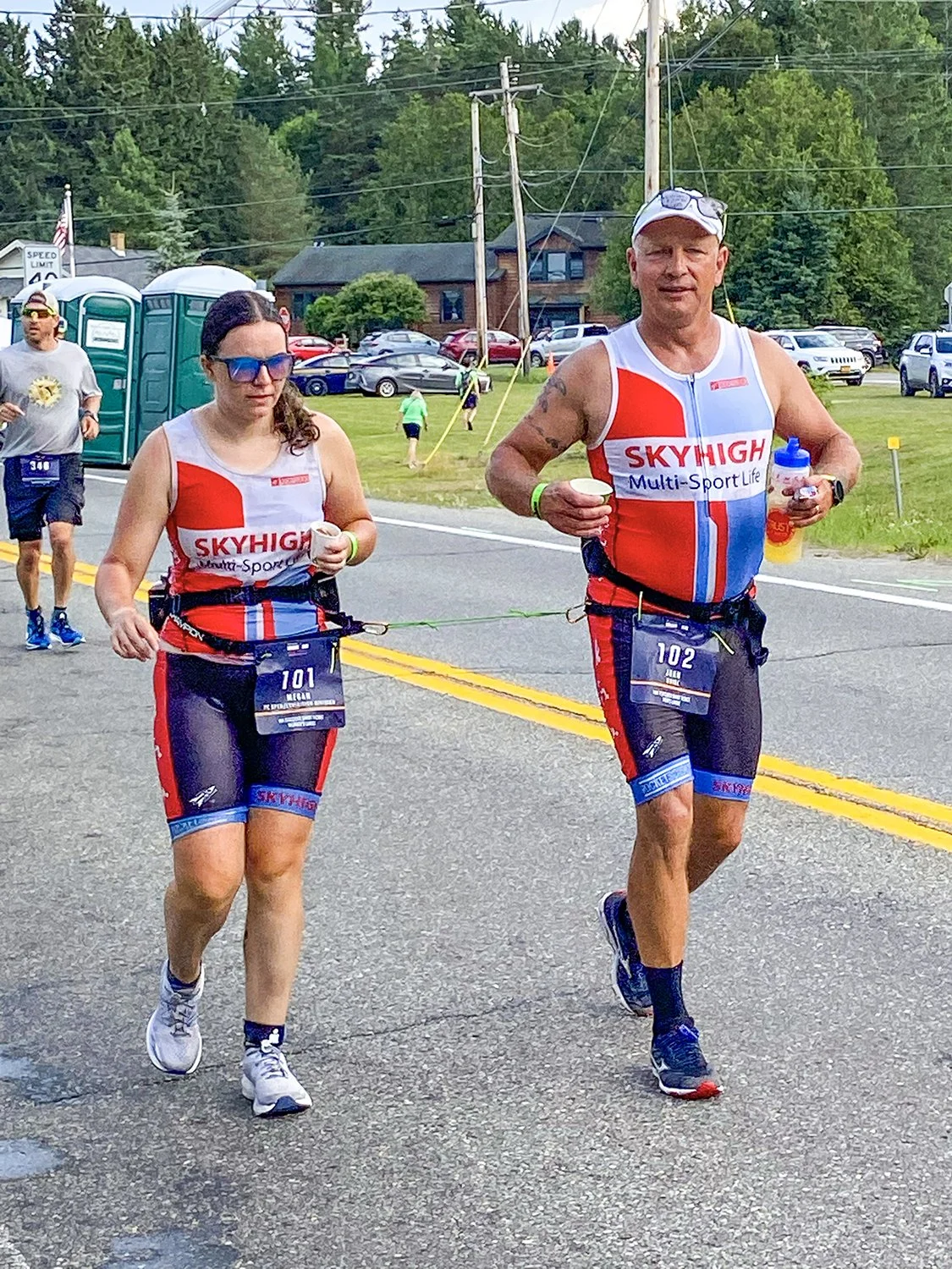 Megan had purchased a tandem bike that worked for her and her guide, but she quickly eclipsed her guide and needed someone faster and stronger. John Slyer of nearby Averill Park, a 19-time Ironman veteran, triathlon coach and owner of SKYHIGH Adventures Youth Triathlon Camp, who had been coaching her (and her guide) fit the bill. The three decided that John would become her guide and so much more. Training continued on a borrowed and adapted tandem, with tethers for the swim and run, made out of running belts! Equipment for adaptive athletes is not readily available so jerry rigging is a must. Megan was used to running with her guide dog Hero and had used a hand tether at Camp Abilities. She and John decided to use a waist tether to give Megan more freedom.