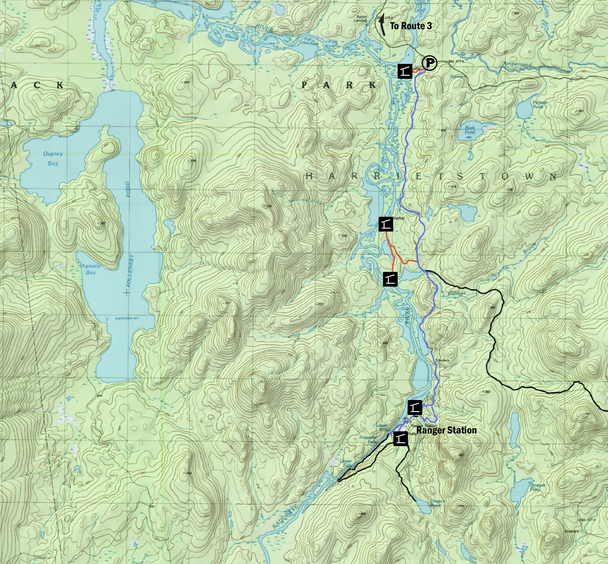 The first thing that happens as you leave the trailhead is the fork to the right, which leads to the Stony Creek Lean-To, just 0.2-mile from the parking area. Despite its name, it stands on the Raquette River and is therefore accessible to boats and canoes. Across the Raquette is a forest of gracefully curving silver maples.