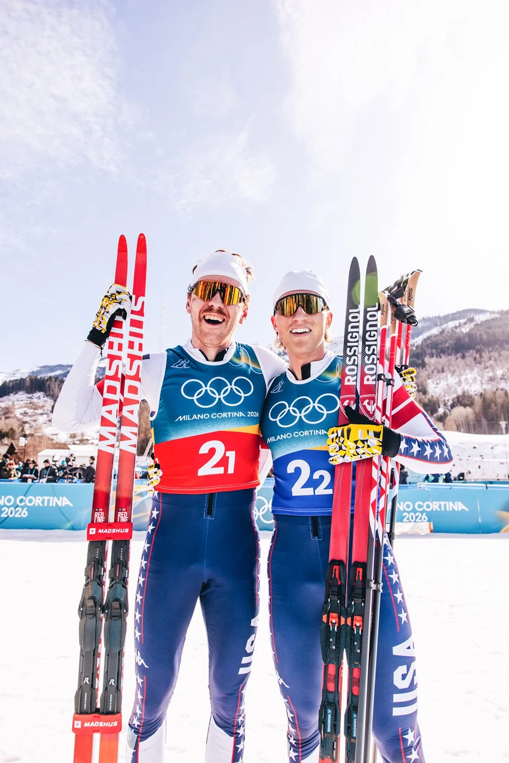 Ben Ogden and Gus Schumacher celebrate their Olympic silver medal in the team sprint at the 2026 Winter Games. @GPOWERSFILM
