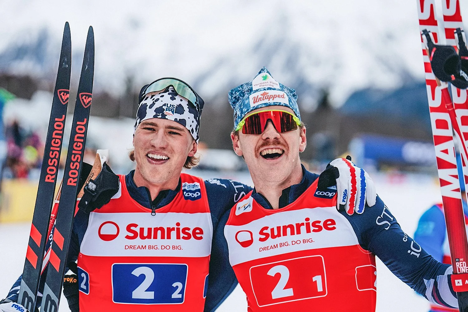 First-ever US men’s team sprint World Cup podium, third place, with Gus Schumacher in Goms, Switzerland on Jan. 23. FIS